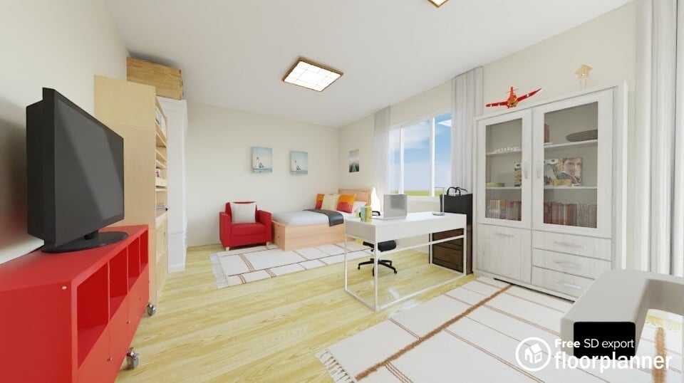Mivel a fiúnak nem tetszik a fehér gardrób felmerült, hogy átfestenék, de erről lebeszéltem őket, a szükséges kellékek, a ráfordított idő, a száradási idők… nem érte volna meg ebben az esetben. A fehér bútoroknak van egy sajátossága, fehér fallal kórházinak tűnnek, de amint színes a fal, kiemelik egymást! Megvárjuk, hogy a fiúnak változik-e a véleménye festés után. A szekrénytől jobbra a háló részhez érkeztünk. A terv egy fa vagy fa erezetű felnőtt méretű 140x200-as ágy beszerzése, alatta olyan tárolóval, ami a láb felől nyitható, így teljesen ki lehet majd azt használni. Ha az ágyneműtartó oldalról nyílna, akkor a tárolási lehetőség fele elveszne, mivel a fal miatt nem férnek hozzá. A kedvenc piros fotel az ágy végébe kerül, továbbra is lehet telefonálásra használni vagy épp szobainasnak. A színes fiókos tárolót egy kis lámpával a tetején, kineveztem éjjeli szekrénynek. A gyerekek feje mellé is mindig teszünk éjjeliszekrényt, komódot vagy valamit, hogy meglegyen a teljes védett helyem van érzet, így nem fog eszébe jutni, hogy éjjel beosonnak a szellemek az ablakon keresztül, mert ott a védelmi “bástya”. Jelenleg nincs függöny ebben a szobában de egyetértettünk abban, hogy legyen! A tágas lábtérrel rendelkező szuper íróasztal kerül a fő helyre - master position - azért ide, mert így az asztalnál ülve a fiú látja mindkét ajtót, nem tudják váratlanul meglepni és a gondolatainak is van helye, hisz szép berendezett tér van előtte, nem pedig fal. Ha ugyanitt befordítanám az asztalt az ablak alá, sose ülne szívesen az asztalnál, hisz hátulra nem lát… A táskának eddig külön ülőhelye volt, azért volt az asztalnál kettő szék. A zárható guruló irodai szekrény bekerül az asztal és a fal közé, így rá lehet tenni a táskát és elköltözhet az egyik szék.