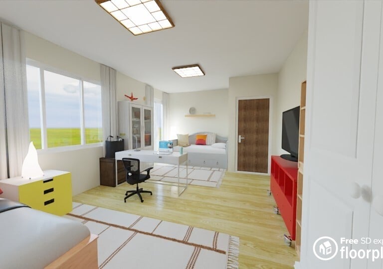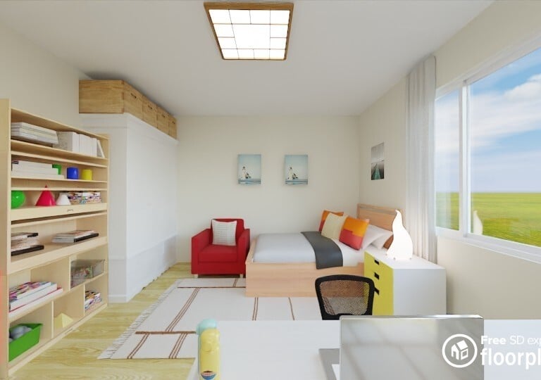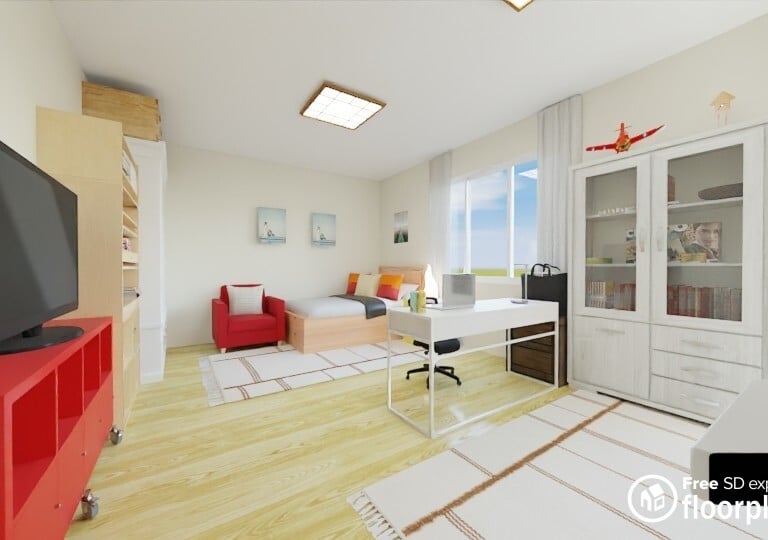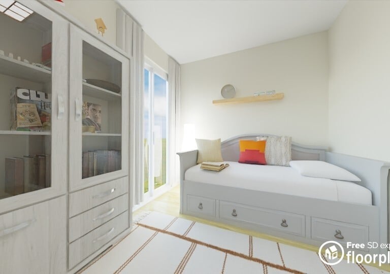 We have arrived at the focal point of this room, to the display cabinet, this is what you see immediately when you open the door. The best use for this teen is to place his LEGO’s display cabinet here to show his creativity and his passion right away! The no see through part of this display cabinet can hide even more LEGO boxes and is close to the daybed too. The large rug defines his living room for the daytime activities and provides comfort at the time, complementing the curtains and the warm but light and bright wall color that replaces the starting point’s cold-cool white.