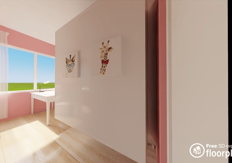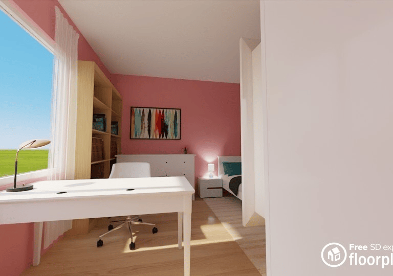 Az íróasztalt azért így helyeztem el, mert így a kislány látja azt, amikor valamelyik ajtón bejön valaki és ez a “fő pozíció” a szobában. Ha berakom az íróasztalt a sarokba, akkor sose fog az asztalnál ülni és nem fogja tudni megmagyarázni, hogy miért nem. Természetesen ezt ki lehet próbálni. Azért sem nyomorgattam valamelyik falhoz az asztalt, hogy legyen helye a gondolatainak és a legjobban kihasználja a természetes fényt, továbbá ha van olyan vizsga, aminél kamerát kell kapcsolni, akkor is rendben van a háttér, látnak egy komódot egy képpel.
